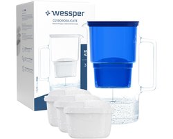 Wessper, Waterfilterkan Wessper D2 Borosilicate, glas, 3L, borosilicaatglas, blauw + 4x waterfilter Aquamax standard , waterfilterpatronen, set