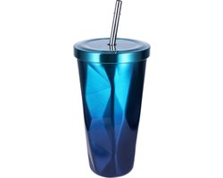 Roestvrijstalen tumbler met stro dubbelwandig drinkbeker koffiebekers 500ml onregelmatige diamant met deksel (blauw-groen)