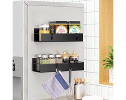 Kruidenrek, magnetisch, koelkast, zelfklevend keukenrek, muur zonder boren, 2 stuks, koelkast, magnetisch rek, hangrek met 4 afneembare haken, koelkastorganizer voor specerijen, zwart