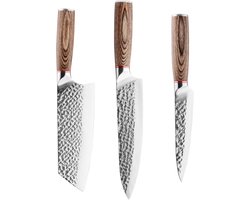 Dastium Home - 3 Delige Hamerpatroon Messenset - Damascus Stijl Japanse Keukenmessen - Messen Met Damascus Print - Met Ergonomisch Pakkahouten Handvat - Koksmes - Nakirimes - Universeel mes
