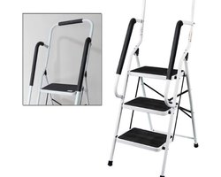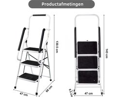 Huishoudtrap met 3 treden - Trapladder met 3 grote stap - Vouwladder - Met Leuning - 150Kg - Staal - Wit