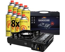 BlockTravel - Gasstelletje noodpakket - Camping gasstel - Gasbrander - Kooktoestel - incl. 8 Butaan Gasbussen - Gas Stove - Draagkoffer