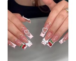 3D Cherry Bow Pearl Faux Nails - White French Tips - Press Nails - Extra Long Square Fake Nails met Design - Glossy Cover - False Nails