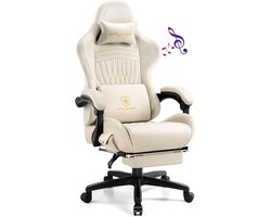 Leren Gaming Stoel, Ergonomische Gaming Stoel, Bureaustoel met Voetsteun, Speakers, Verstelbare Hoofdsteun en Lendesteun, Kantelbare Rugleuning, Ivoor Wit