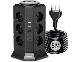 Verticale Stekkerdoos met 12 Universele Stopcontacten (ITA/Schuko), 2 USB-C PD 20W en 3 USB-A Poorten, 5 Meter Kabel en Schakelaars