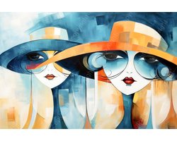 JJ-Art (Canvas) 90x60 | 2 Vrouwen met hoed en bril in abstract modern surrealisme, kunst | mens, vrouw, oranje, rood, blauw, wit | Foto-Schilderij canvas print (wanddecoratie)