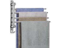 JSVER Handdoekrek RVS 40CM, 180° draaibaar Handdoekrek met 4 armen Handdoekrek met draaibare arm en haken Ruimtebesparend voor badkamer, keuken en garderobekast - Zilver
