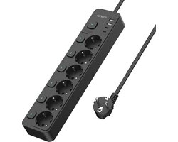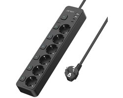 JSVER Power Strip met 6 Stopcontacten en 2 USB A,2 USB C,USB Power Strip (3680W 16A) Individueel Schakelbaar, Meerdere Stopcontacten voor Smartphones, Tablets,2m Kabel-Zwart