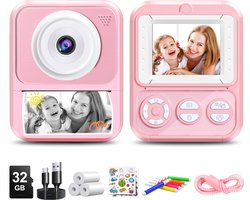 Korffe Kindercamera – Instantcamera met 3 rollen printpapier & 32GB kaart – 2.4 inch scherm – Digitale camera met 6 gekleurde stiften – Cadeau voor kinderen van 3-14 jaar