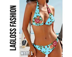 LaGloss® Dames Bloemenprint Bikini Set – Hoge Stretch – Lace-Up Halter Bikini in Roze & Blauw – Verstelbare Zwemkleding voor Strand & Zwembad- Maat L
