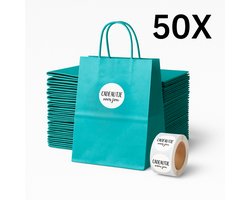 Papieren Draagtas (S) - Zee Groen / Cyan - (Inclusief Stickers “Cadeautje voor jou”) - 50 Stuks - 18x8x22 cm - Papieren Tasjes - Kraft Tas - Tassen - Cadeau Tas - Hoogwaardig Natron Kraft Papier - Eco-vriendelijk