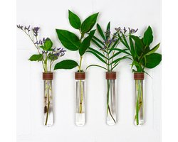 TWILG - Magnetische Muurvaasjes - 4 Stuks - Stek vaasjes - Glas - Cognac leer - Stekjes - Moderne vaas - Stekstation - Wandvaas - Droogbloemen - Reageerbuisjes