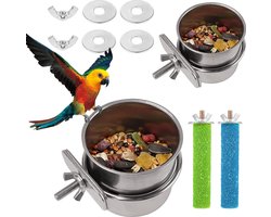 Vogel voerbak 2 stuks, kleinere vogelbak met huisje voor papegaaien, watervoerbak voor vogels, 2 stuks zitstange, naturel houten zitstange voor het onderhoud van klauwen en snavels