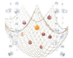 ZERODECO Visnet decoratie, natuurlijk visnet, feestdecoraties voor marine decoratie, zeemeermin piraten, feest, bruiloft, verjaardagsfeest, katoenen visnet met schelpen, blaasslingers, beige