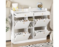 Edele witte schoenenkast met 4 scharnierdeuren, 2 lades, 3 open vakken - perfect voor moderne gangen en entrees, afmetingen 110 x 26 x 100 cm