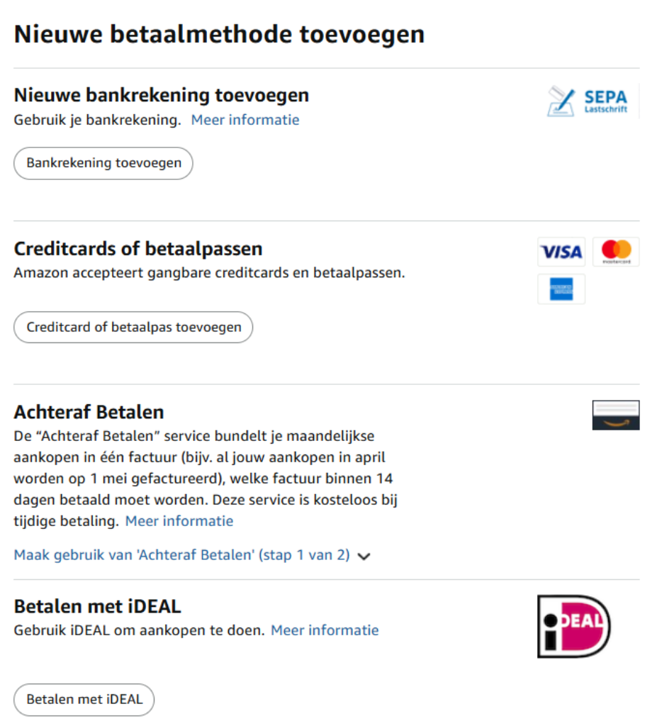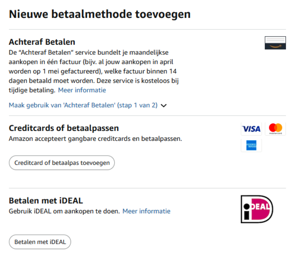 Bij Amazon Duitsland en Nederland kan je zelfs “Achteraf betalen”. Dit kan echter enkel als je ook een factuuradres hebt in het land van de Amazon winkel (Duitsland of Nederland).